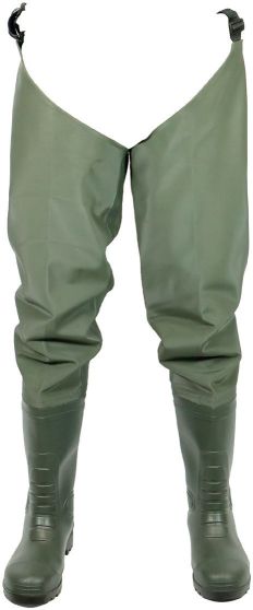 Robuste Hüftstiefel in Grün aus strapazierfähigem PU/PVC Material. Ideal für Watgänge in Schweizer Gewässern. Grösse 38 bietet sicheren Halt beim Fischen.
