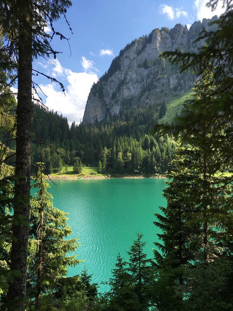 Der dunkelblaue See liegt eingebettet zwischen den Zwillingsgipfeln der Jumelles, dem Grammont und dem Col de Taney. Er scheint keinen sichtbaren Abfluss zu haben und ist umgeben von Alpwiesen, hohen Fichten und grauem Fels. Das Gebiet rund um den See wurde bereits in den 1960er Jahren unter Naturschutz gestellt, wodurch Pläne für einen Massentourismus rechtzeitig verhindert wurden.