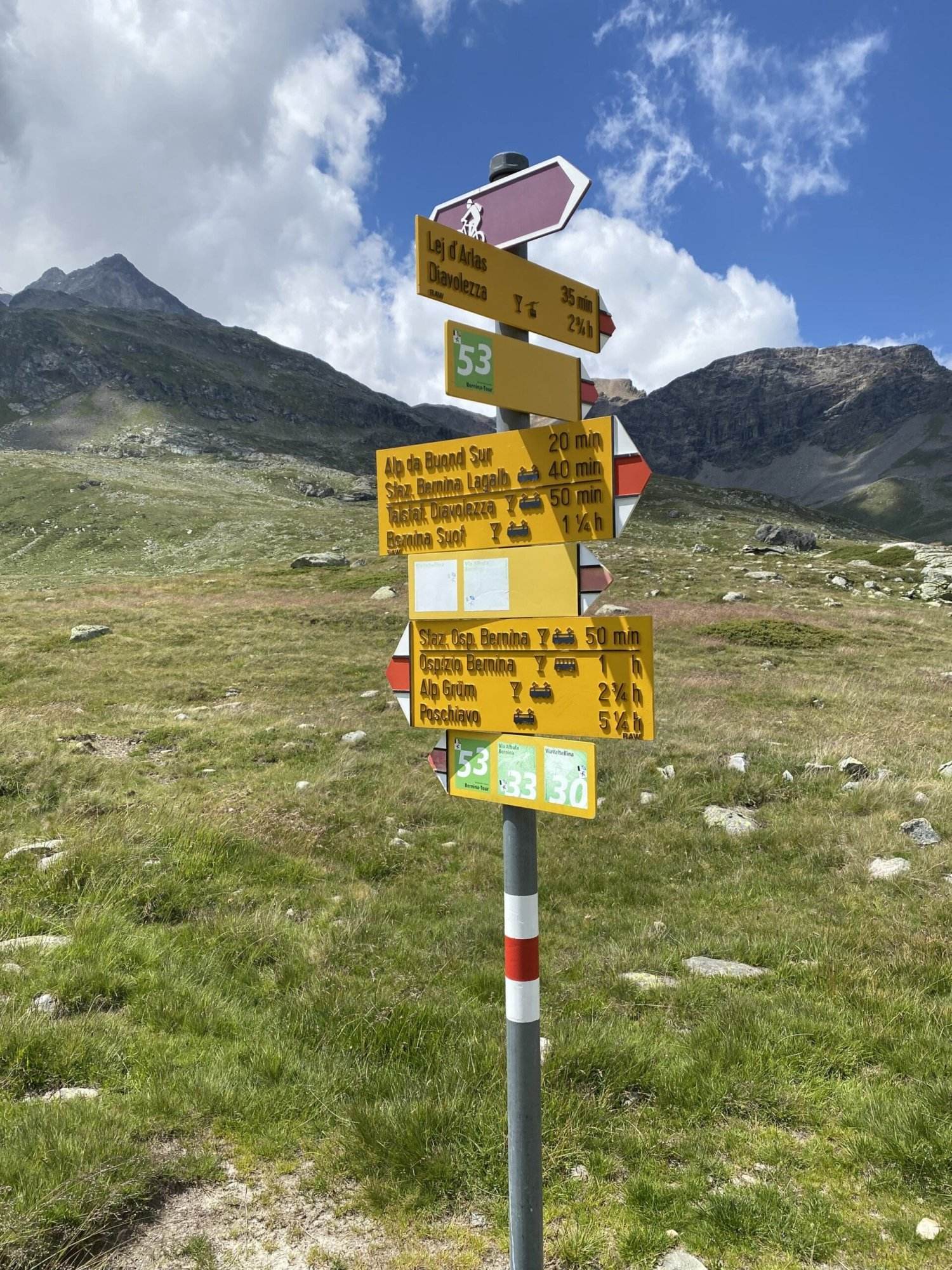 Auf einer Höhe von 2218 Metern über dem Meeresspiegel gelegen, bietet der Lej Pitschen ein reizvolles alpines Panorama. Er ist der weitaus kleinste der drei aneinander gereihten Seen auf dem Berninapass und stellt daher eine intime Erfahrung der alpinen Landschaft dar.